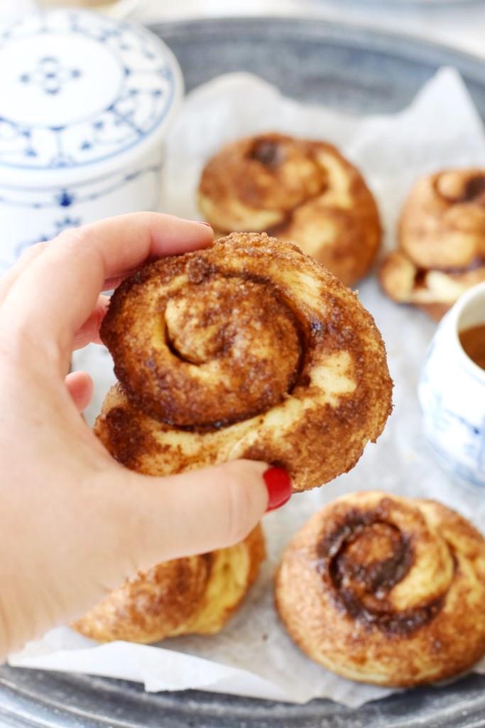 Vorheriges Bild Bolus Rezept Unterfreunden Foodblog Frauenhand mit roten Fingernägeln hält einen Zeeuwse Bolus, die berühmte zeeländische Zimtschnecke