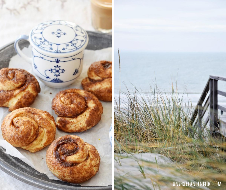Links: 4 Zimtschnecken, serviert auf einem grauen runden Tablett, eine blau-weiße große Kaffeetasse im Hintergrund. Rechtes Foto: Dünengras und Meer, Zeeland im Winter