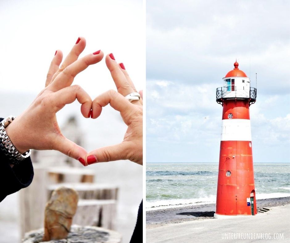 Vorheriges Bild Nächstes Bild Zeeland Tipps Guide Unterfreundenblog Linkes Foto: Herzchenhände, im Hintergrund Buhnen und Nordsee / Rechtes Foto: Leuchtturm in Westkapelle, Zeeland