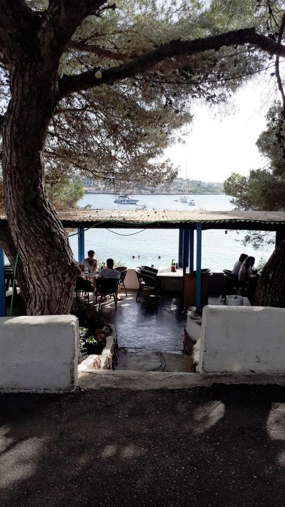 Die kleine Bucht neben der Blue Bar bietet keine Liegen, dafür aber wunderbare Schattenplätze am kleinen Sandstrand und auf den rauen Felsen unter den Pinien.