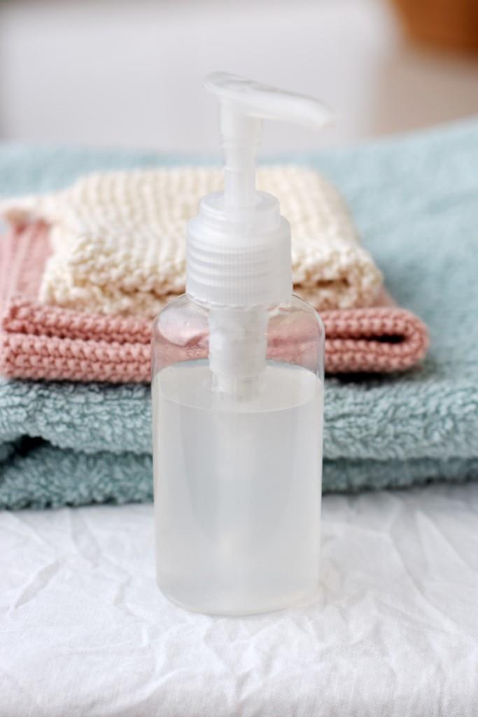 Vorheriges Bild Nächstes Bild DIY Desinfektionsmittel Hände einfach selbst gemacht – Unterfreunden Blog Pumpspender mit Desinfektionsmittel vor 3 Handtüchern in grün, rosé und creme