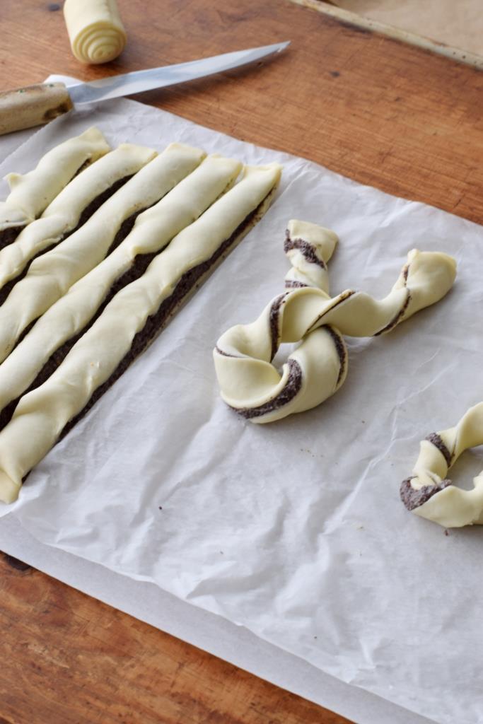 Vorheriges Bild Nächstes Bild Blätterteig-Mohn-Orangen-Hasen zu Ostern – Unterfreundenblog (14) 5. Schritt 4: Aus den gedrehten Blätterteig-Stangen Hasen formen