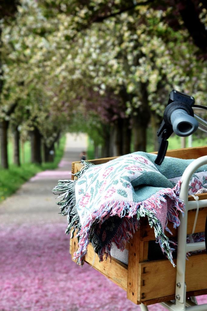 Vorheriges Bild Nächstes Bild Radtour Kirschblueten Allee Unterfreundenblog Weißes Holland-Fahrrad mit Weinkisten-Korb und Picknickdecke auf einer Allee aus blühenden Kirschbäumen