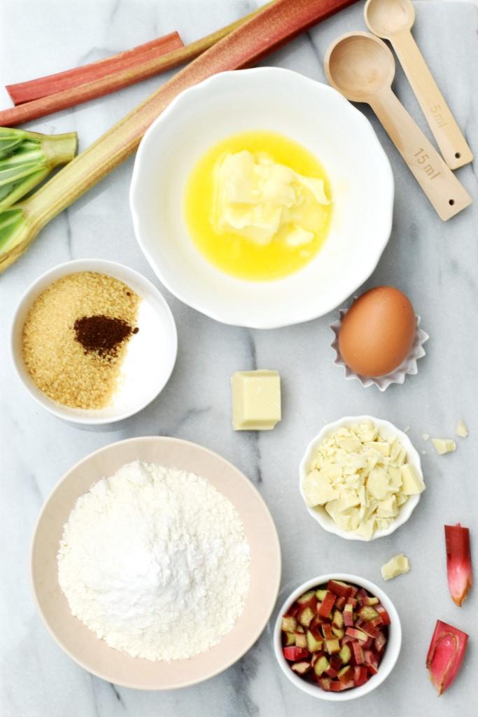 Vorheriges Bild Nächstes Bild Hurra Rhabarber-Zeit! Rhabarber-Cookies mit weißer Schokolade – einfaches Rezept auf Unterfreunden Blog Zutaten für die Rhabarber-Chocolate-Cookies, angerichtet in verschiedenen Schälchen auf einer grauen Marmorplatte