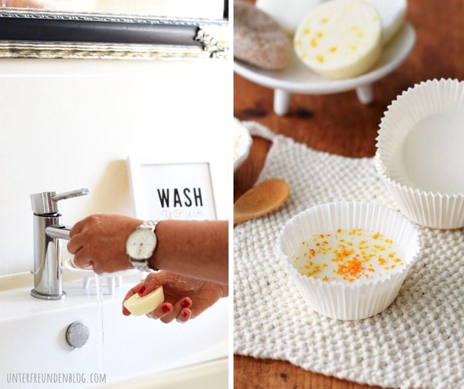 Nächstes Bild DIY Seife einfach selbst machen und Freebie Poster Wash your hands – Unterfreunden Blog Linkes Foto: Frau wäscht Hände mit Seifenstück Rechtes Foto: Selbstgemachte Orangen Seife in Muffin Papierform