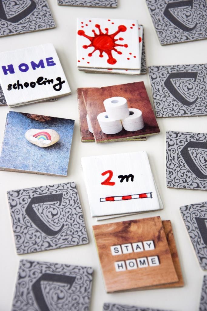 Die Kinder haben das Corona Memory selbst gestaltet und Kärtchen gemalt! 2 Meter Abstand halten, Virus, Home Schooling, Smiley mit Maske usw.
