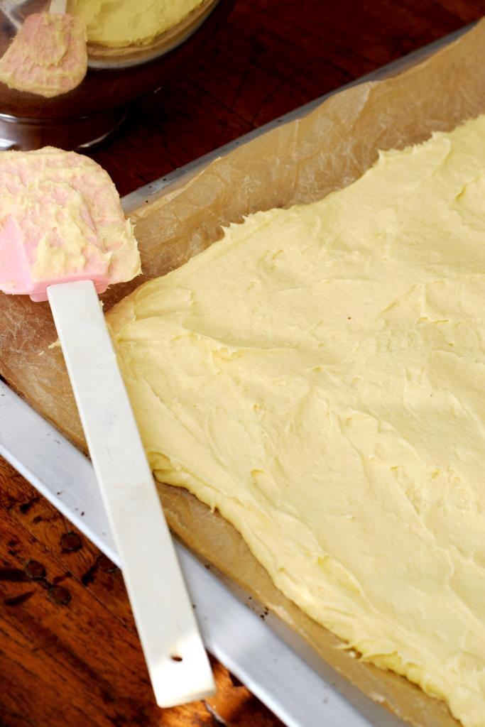 Vorheriges Bild Nächstes Bild Alles wird gut Regenbogen Kuchen Rezept Unterfreunden Blog (2) Der Biskuit Rührteig wird auf das Backblech aufgestrichen. Hilfreich dabei: Backpapier und ein Kuchenspatel
