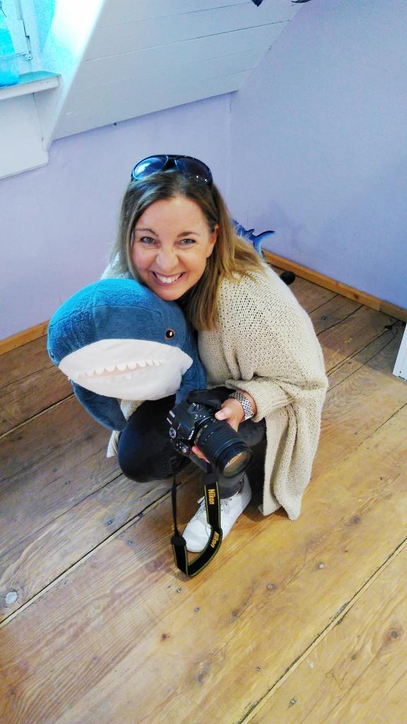 Vorheriges Bild Nächstes Bild Mein Besuch im Blau Museum Schwetzingen / Unterfreundenblog Kuscheln fürs Foto: Ich kuschele mit dem blauen Plüsch-Hai im blauen „Tierzimmer“ des Blau-Museum