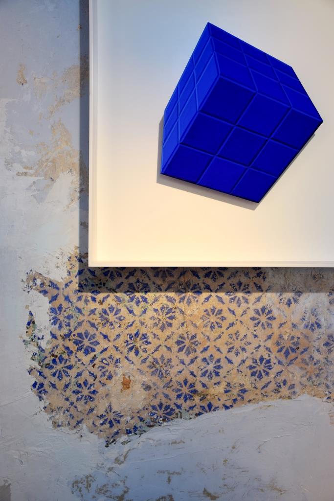 Vorheriges Bild Nächstes Bild Blau Museum Schwetzingen Unterfreundenblog (4) Alte handbemalte Kacheln, die an der Wand freigelegt wurden neben zeitgenössischer Kunst, einem Kubus in Ultramarin