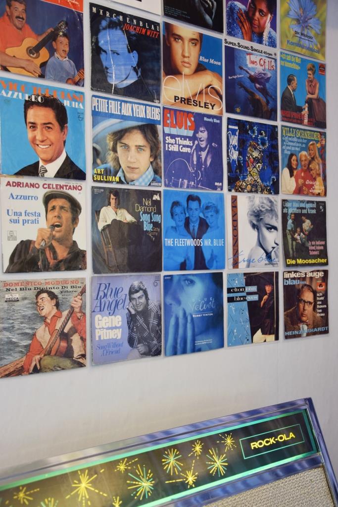 Hier spielt der Blues! Alle Musiktitel in der Musikbox haben das Wort Blue, Blau, Azzurro im Titel. Die Cover sind über der Musikbox an der Wand angebracht