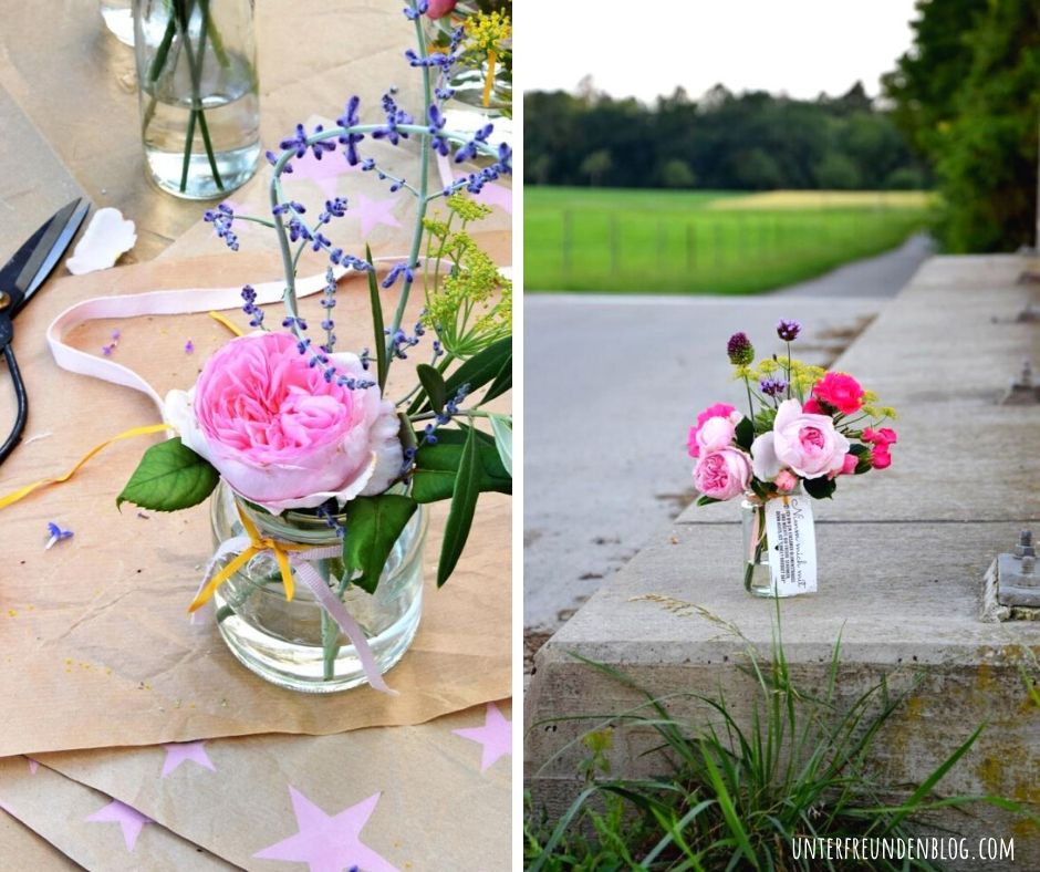 Linkes Foto: Blumen aus dem Garten als kleines Sträußchen in einem alten Marmeladenglas / Rechtes Foto: das Mini-Sträußchen wird am Lonely Bouquet Day „ausgesetzt“, um dem Finder eine Freude zu bereiten. Hier steht das Glas mit dem Strauß an einer einsamen Straße am Feldrand