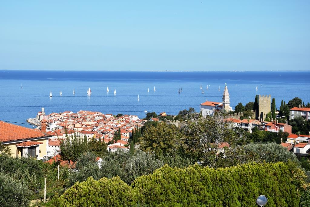Vorheriges Bild Nächstes Bild Piran – Slowenien Roadtrip Sommerurlaub – Unterfreundenblog Ausblick auf Piran und das blaue Mittelmeer von der Ferienwohnung aus