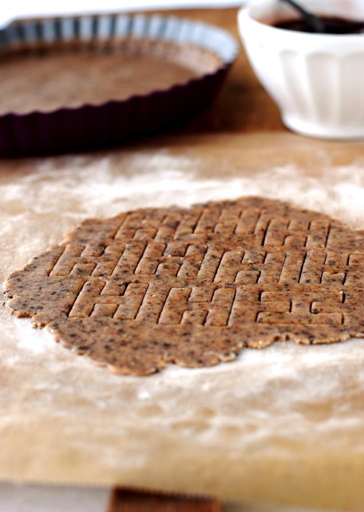 Springform oder Tarteform fetten und den Teig für den Boden entweder mit den Händen direkt in die Form drücken oder zwischen zwei Lagen Backpapier etwa 1 Zentimeter dick ausrollen und in die Form legen. Formt dabei einen kleinen Rand.