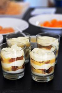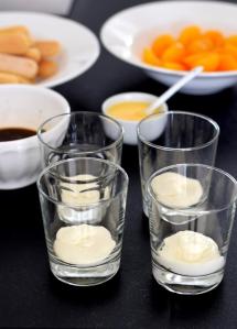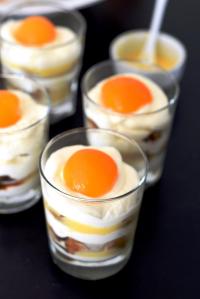 Mit einer Schicht Creme abschließen und für den Spiegelei-Look jedes Glas mit eine Aprikosenhälfte auf der Creme verzieren.