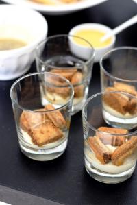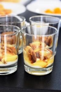 Jeweils drei Stücke Biskuit auf der Creme in den Gläsern verteilen. Ein bisschen Eierlikör darüber träufeln und eine weitere Schicht mit Creme, in Espresso getunkten Löffelbiskuits und etwas Eierlikör in die Gläser schichten.