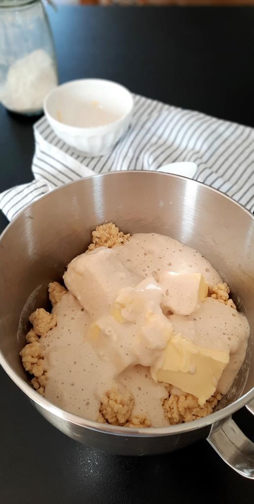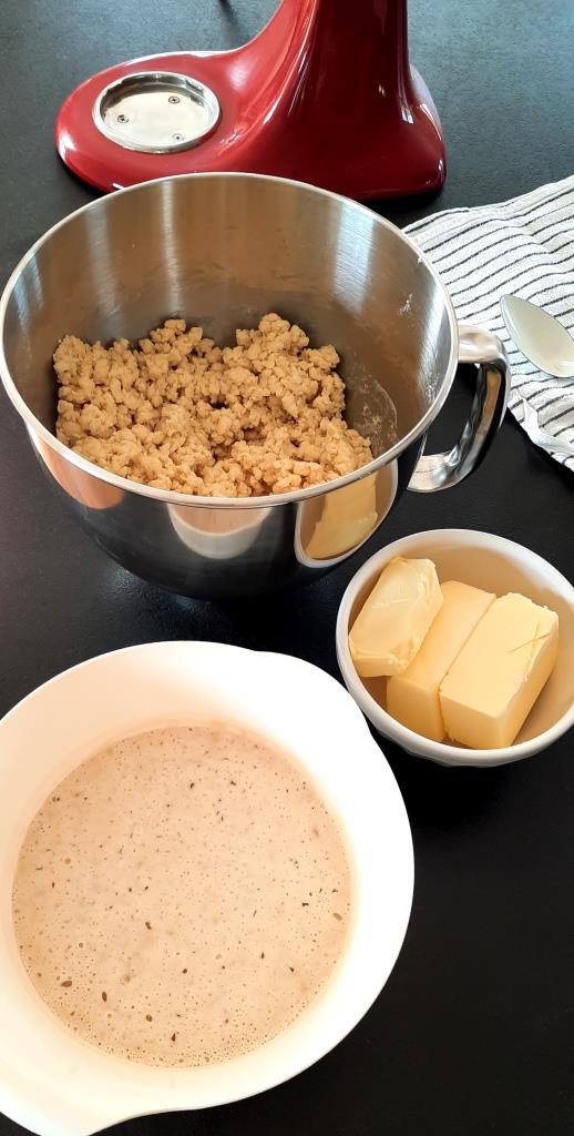 - Gebt die weiche Butter und den Vorteig dazu und verknetes alles zu einem Teig. Diesen Teig zugedeckt an einem warmen Ort noch einmal für ca. 1 Stunde gehen lassen.