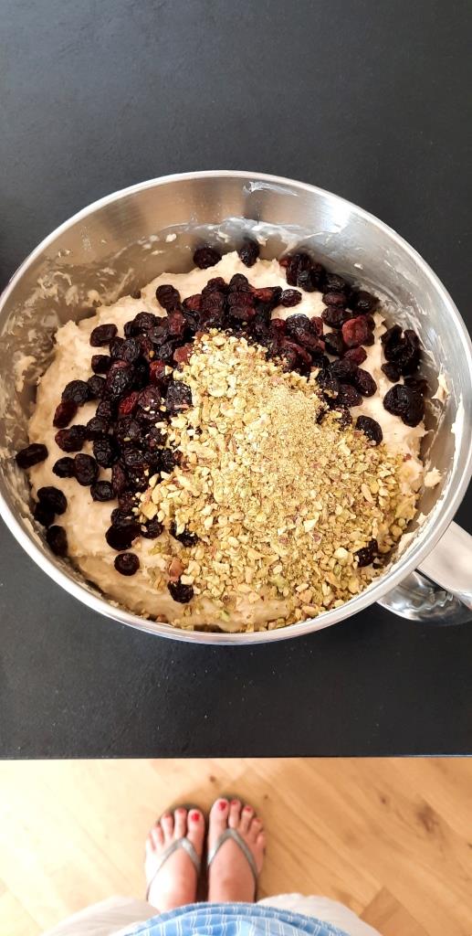 Ich mochte übrigens die Variante mit Schoko und Pistazien lieber, der Mann war eindeutig Team alkoholisierte Cranberries ;-). So seht Ihr ihn auch auf den Fotos. Also den Gugelhupf, nicht den Mann!