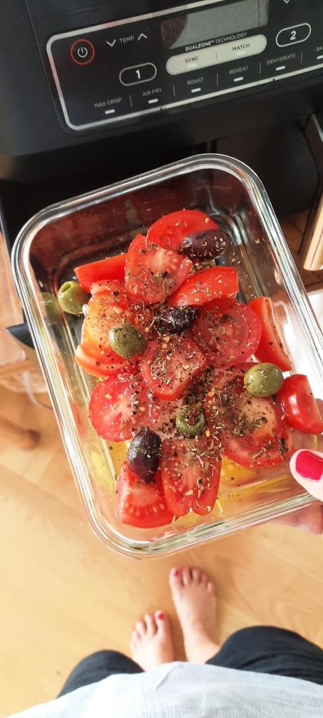 Falls Ihr das nachmachen wollt: Einfach einen Feta und frische Tomaten und Oliven (geht auch ohne) in einer feuerfesten Form im Airfryer oder Ofen backen. Vor dem Backen mit Salz, Pfeffer, italienischen Kräutern und Olivenöl würzen.